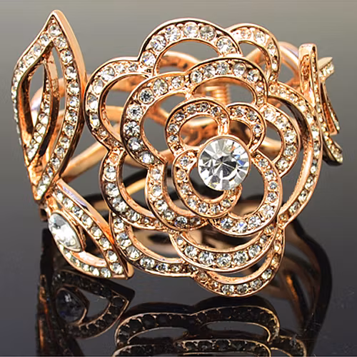 Armbandet är utformat som en blomma med blad som sträcker sig runt armen.