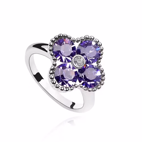 Vacker silvrig ring med fyra lila kristaller som bildar en blomma.