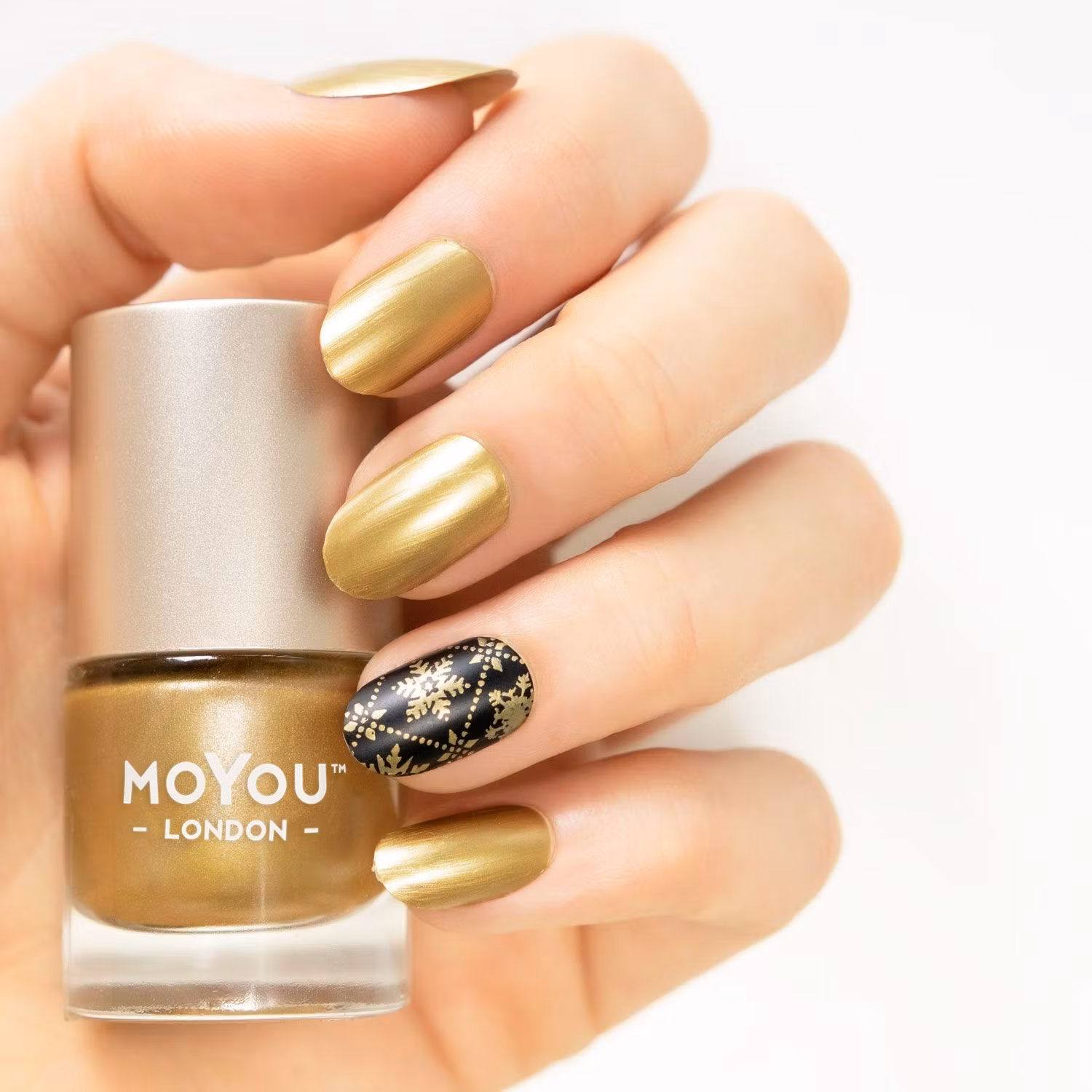 Guldfärgat nagellack från MoYou London. Superfin färg till att stämpla vackra mönster på naglarna. Det högpigmenterade lacket ser till att du får ett bra resultat även med väldigt detaljerade mönster.