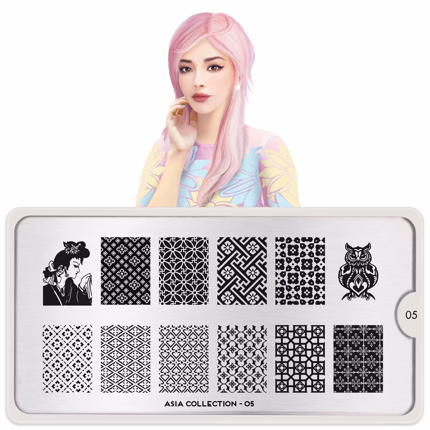 MoYou London Asia 05 innehåller 12 olika designer, var och en med måtten 1,5 x 2 cm.