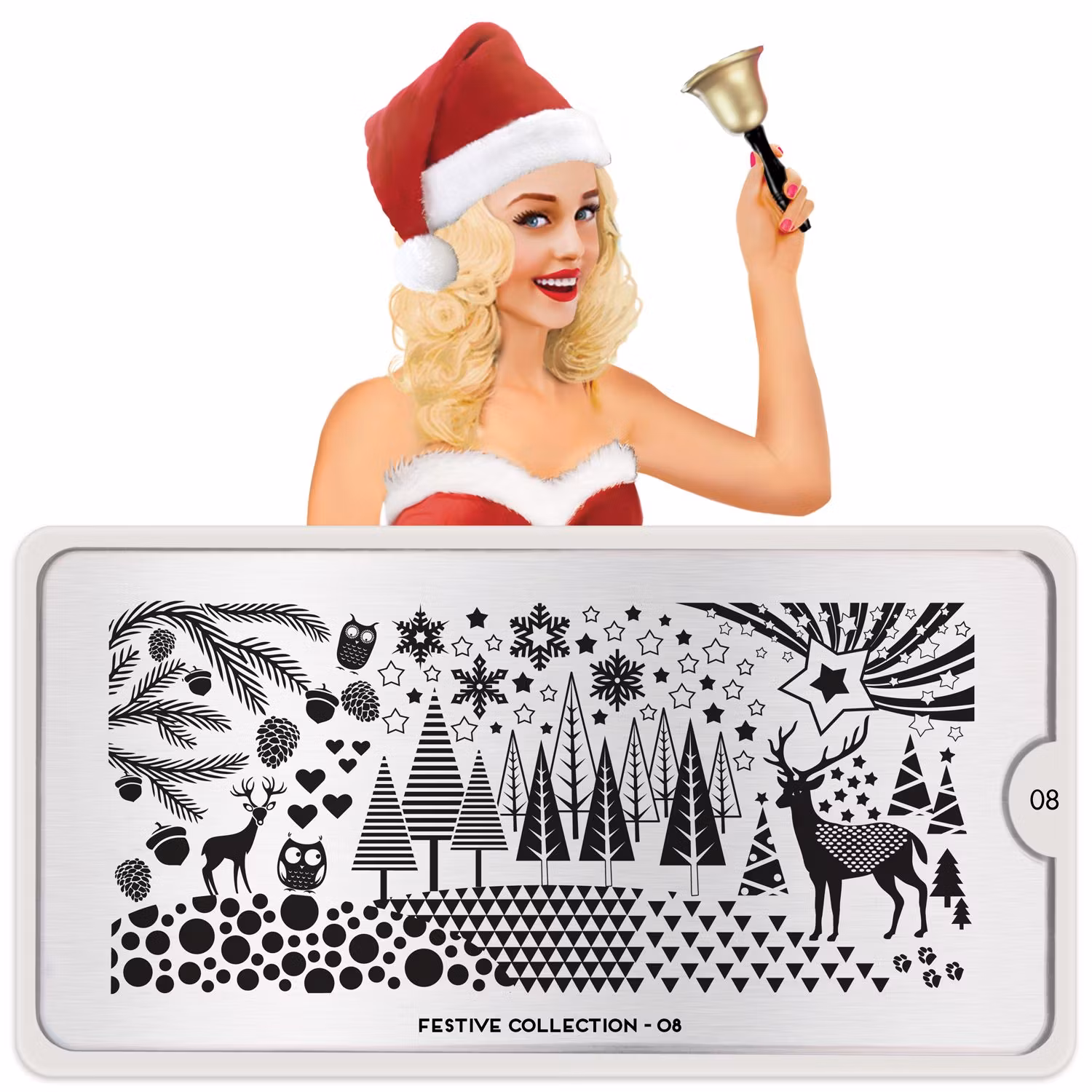MoYou London Festive 08 innehåller en stor design med flera mönster i.