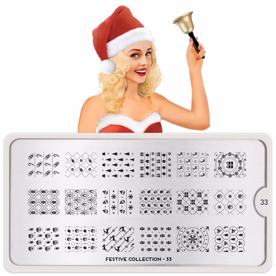 MoYou London Festive 33 innehåller 18 olika designer, var och en med måtten 1,2 x 1,5 cm.