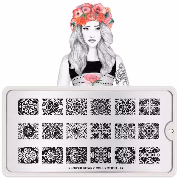 MoYou London Flower Power 13 innehåller 18 olika designer, var och en med måtten 1,2 x 1,5 cm.