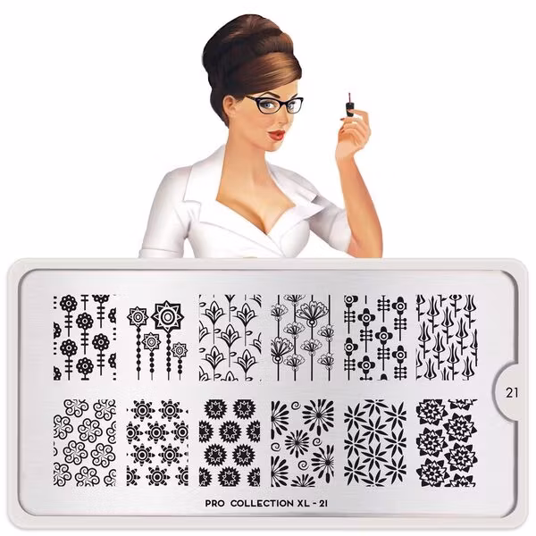 MoYou London Pro XL 21 innehåller 12 olika designer, var och en med måtten 1,5 x 2 cm.