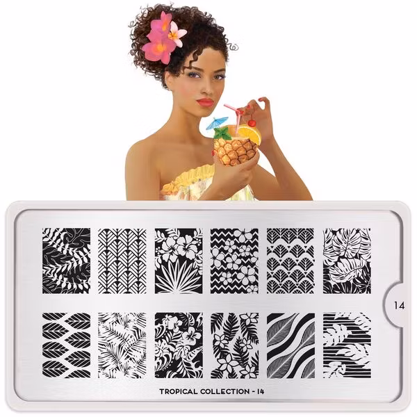MoYou London Tropical 14 innehåller 12 olika designer, var och en med måtten 1,5 x 2 cm.