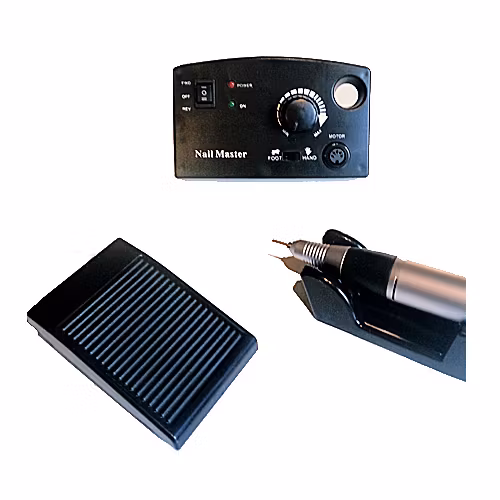 Liten och smidig elfil till naglar. Hastigheten kan styras både från bordsenheten eller med en fotpedal som medföljer. Hastigheten kan ställas in ända upp till 35000 varv. Det går även att välja rotationshåll, så den passar oavsett om du är vänster eller högerhänt. Det finns en hållare till filen på bordsenheten och det följer även med en extra hållare som man kan ha på bordet om man hellre vill ha det.